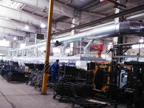 針對機(jī)器人、專機(jī)焊接,根據(jù)現(xiàn)場實(shí)際情況,將每個機(jī)器人工位獨(dú)立出來,設(shè)計(jì)一個獨(dú)立的焊接房或吸氣罩,焊煙通過焊接房或吸氣罩收集起來,統(tǒng)一的系統(tǒng)管路統(tǒng)一匯入除塵器凈化處理,終將凈化后的空氣由統(tǒng)一的排氣口排放至大氣中。